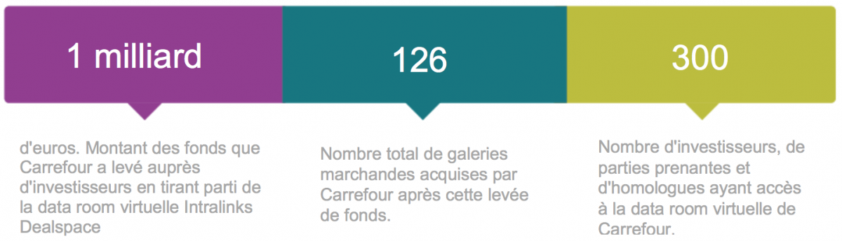 Le groupe Carrefour, qui avait déjà recours à différentes data rooms virtuelles et outils similaires, a choisi d’utiliser Intralinks Dealspace pour cette transaction. Un choix en partie lié au fait que le vendeur des 126 galeries marchandes avait à l’origine utilisé Intralinks Dealspace lors de sa propre période de due diligence. Les membres du groupe Carrefour ont tellement apprécié la data room virtuelle du vendeur des biens qu'ils l'ont répliquée pour le projet de levée de fonds Carmila.